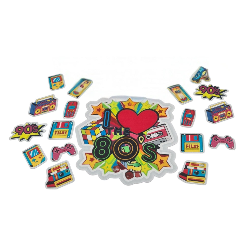 1 großen I love 80s Tortenaufleger und 17 kleine Retro Tortenaufleger.