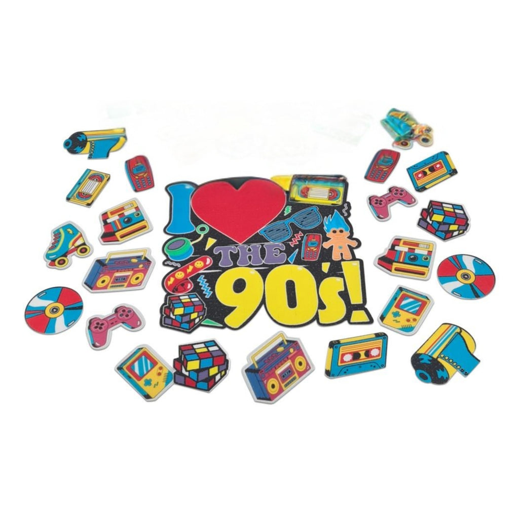 1 großen I love 90s Tortenaufleger und 17 kleine Retro Tortenaufleger.