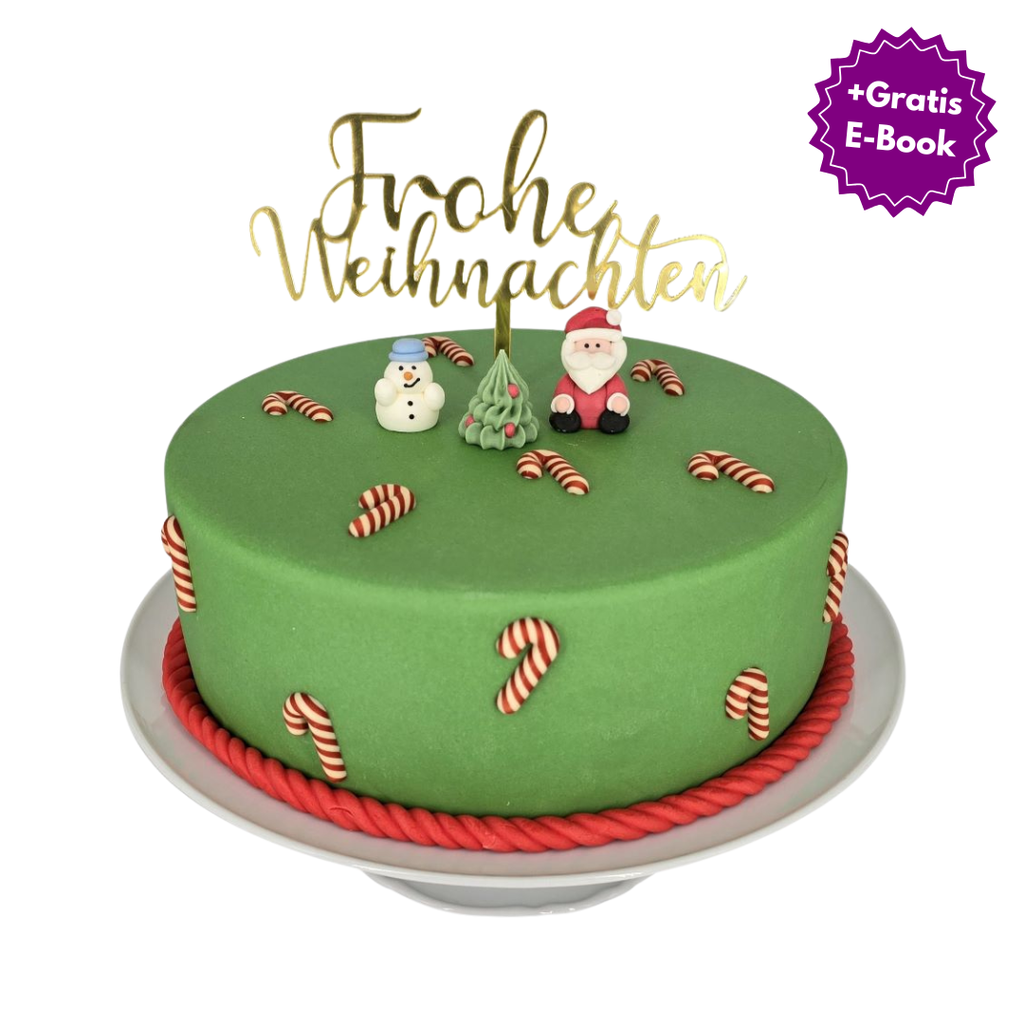 Ho, Ho, Ho! Der Weihnachtsmann bringt nicht nur Geschenke, sondern auch eine tolle Weihnachtstorte! Zaubert eine tolle Fondant Torte zu Weihnachten mit unserer "Weihnachten" Fondant Hülle. Mit einem süßen Weihnachtsmann aus Zucker, leckeren Zuckerstangen aus Schokolade, einem goldenen Frohe Weihnachten Topper und natürlich einer grünen Fondanthülle zaubert ihr einen perfekten Hingucker für euer Weihnachtsfest.